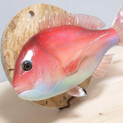 こちらは主に催事で販売しております。 魚をモチーフにしたオブジェです。部屋のインテリアとして壁に掛けたり置いたり飾っていただけます。 一つ一つ芯材を削って作成していますので基本一点モノとなっています。